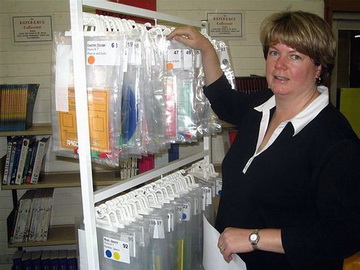 Raeco Hangbags clip at the top but don't completely seal. Add the large, crisp, clear labels Sue prepared for Southern Cross Primary School, Canberra, and its all 'ready to roll'. If you are interested in the 'Raeco solution' ask your Librarian, or check the Raeco web site.