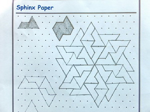 - http://www.origamiheaven.com/pdfs/sphinx.pdf begins with the leftover rectangle created when A4 (or other metric paper) is folded to remove the largest possible square. David Mitchell, Origami Heaven, shows how to fold this often discarded part to create a Sphinx. Now you can have lessons about the square and save all the leftovers for later lessons about the Sphinx. However, David's information gives away some of the answers that as teachers we would like the learners to tackle as challenges. So we approached David and with his permission have produced a modified document that gives the same instructions on Folding Sphinx Tiles and ends with an invitation to record on Sphinx Paper, without giving away any of the challenges.
