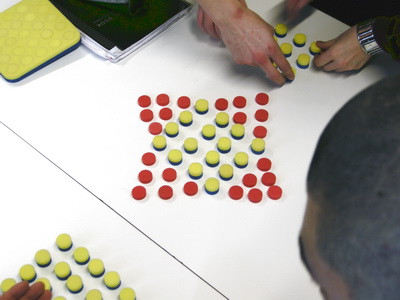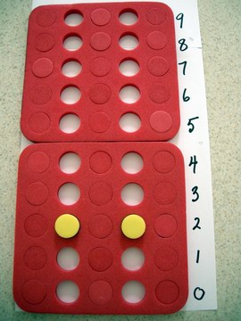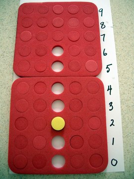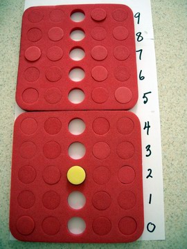 1. Ask students to push out 5 yellow/blue plugs then put the yellow/blue board back into the bag and also to take out the red board and remove all the plugs from the first, third and fifth rows and put them back in the bag too.