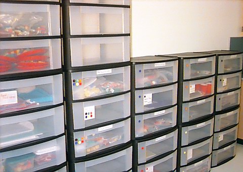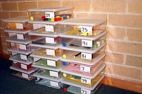 A classic task centre arrangement. Tasks in see-through boxes on attractive display shelves in a purpose designed room. Note the 'book style' arrangement of the boxes.